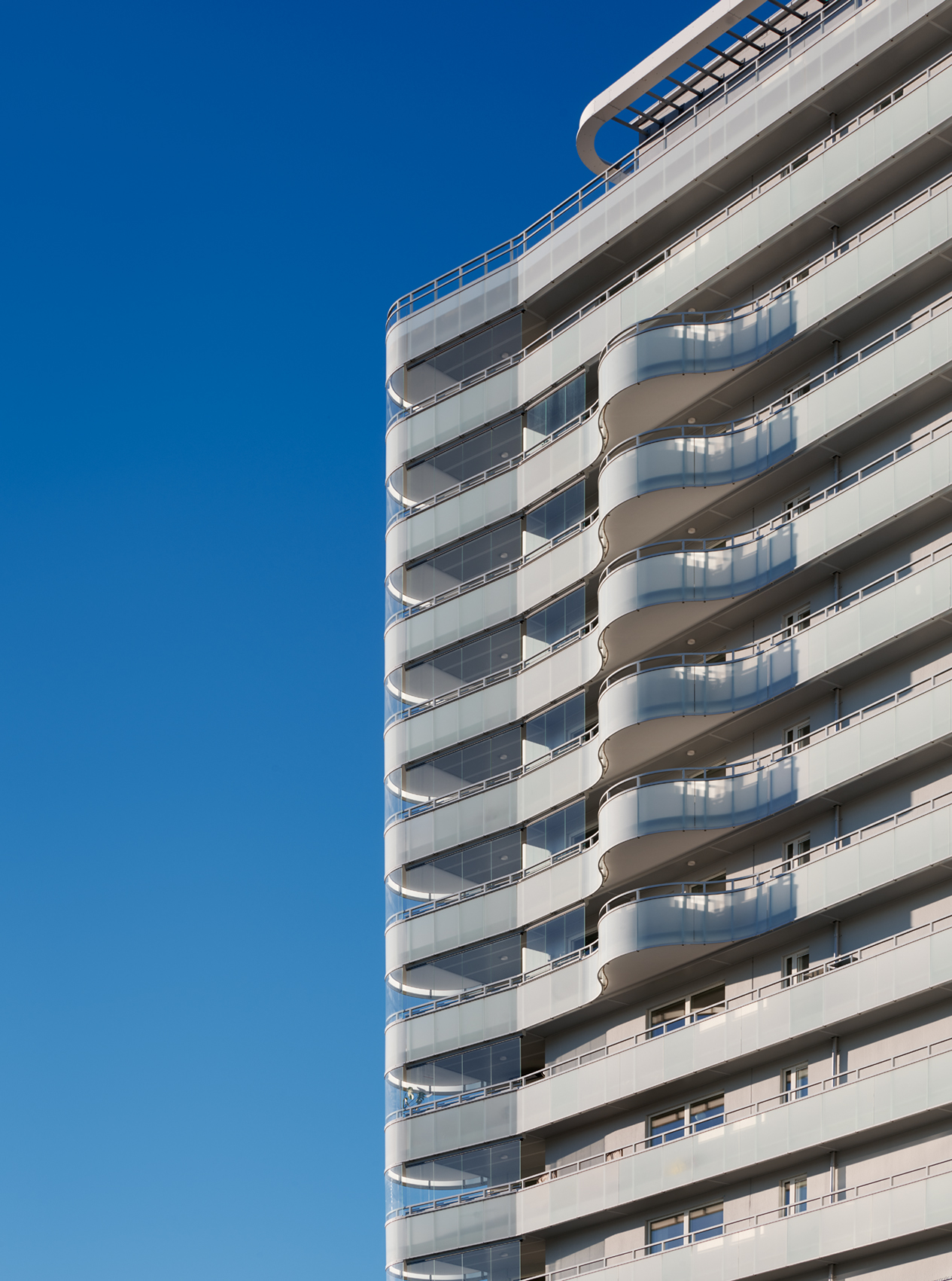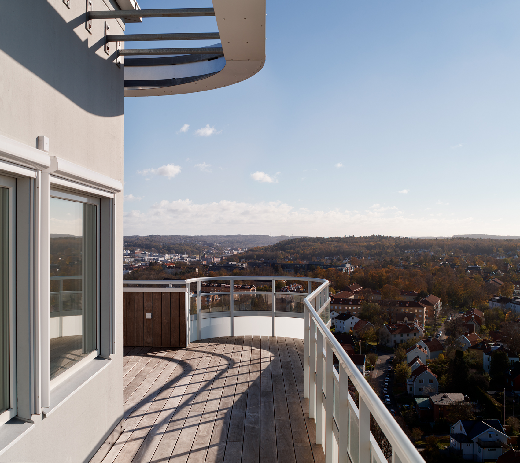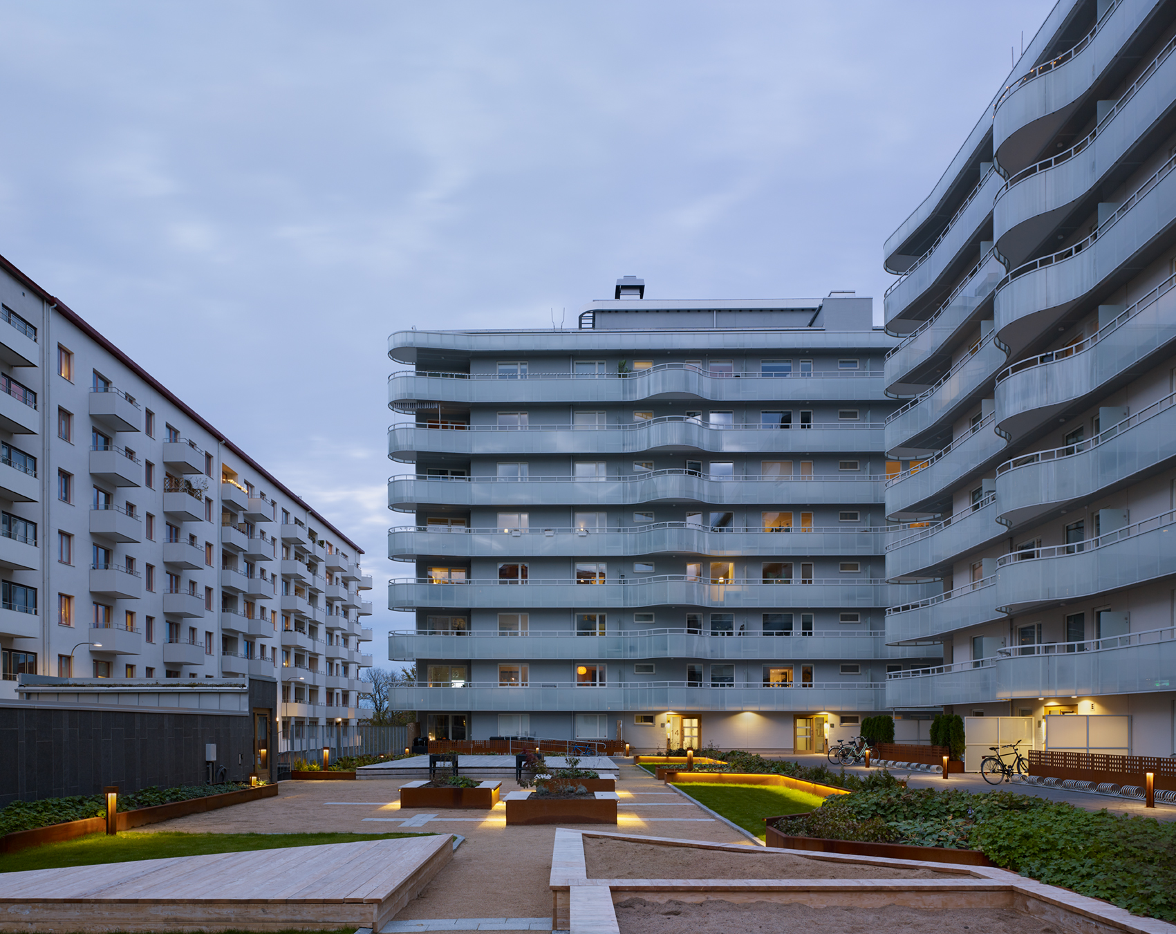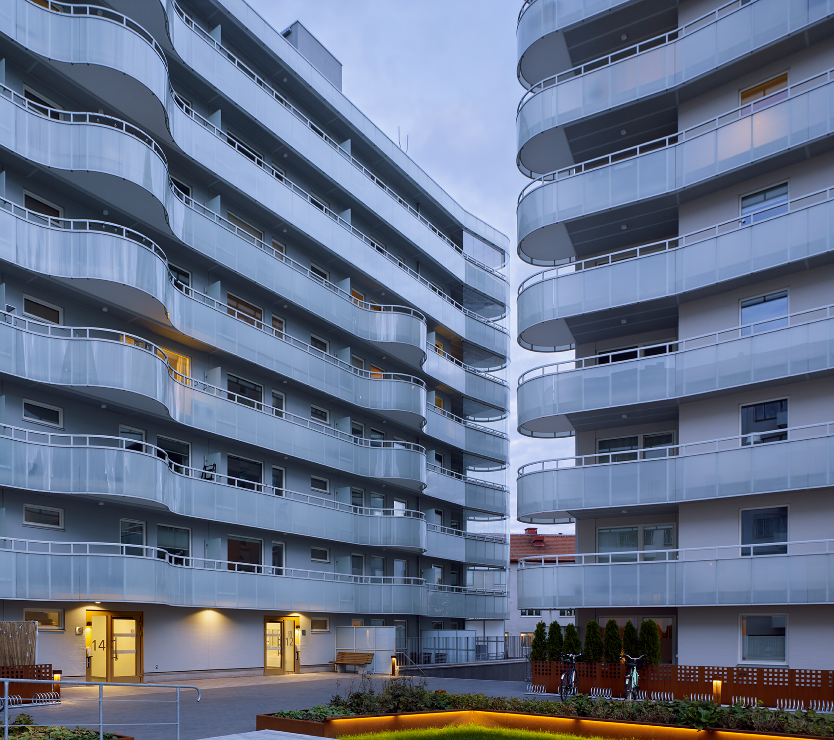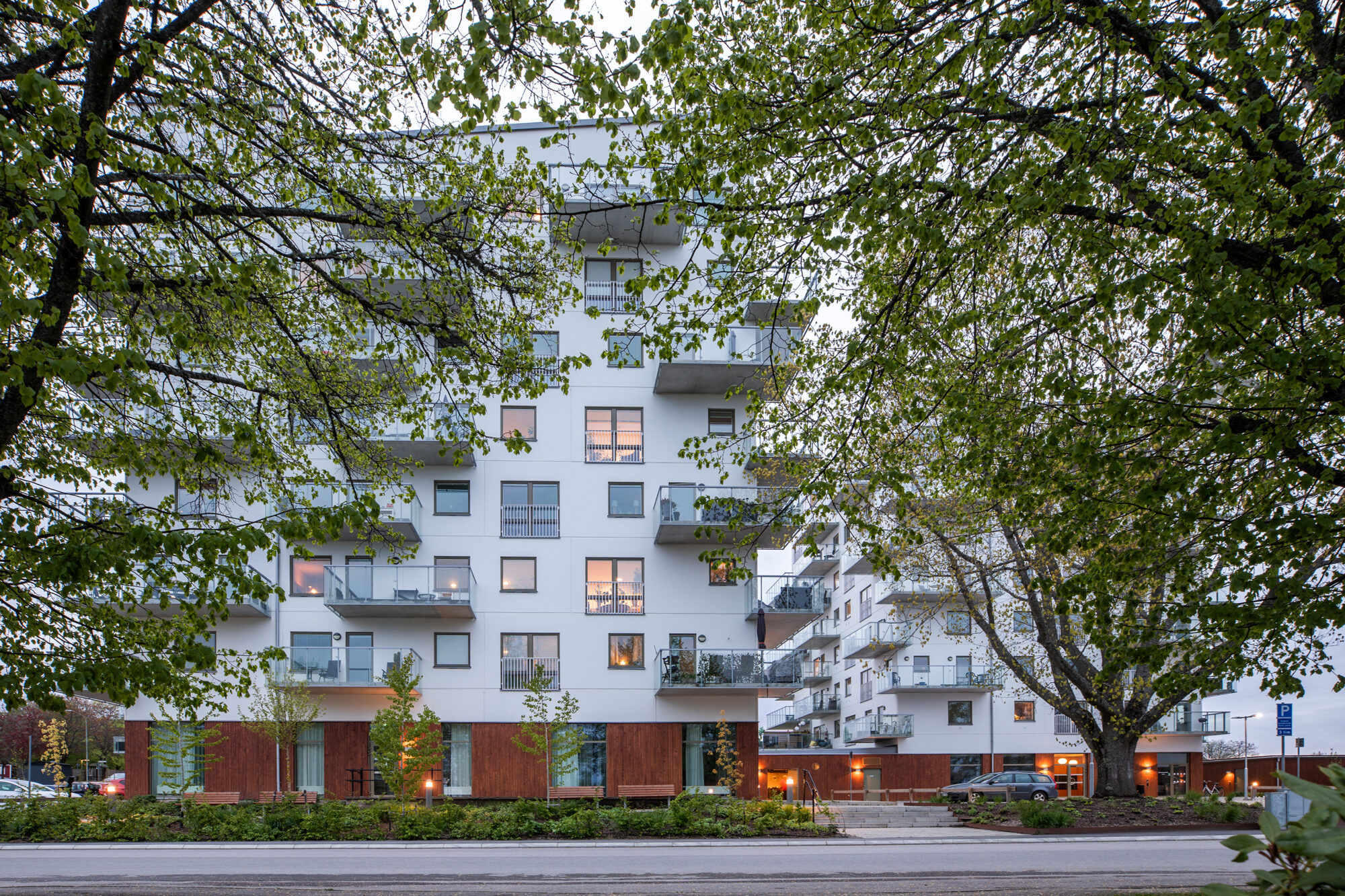 Övre Johanneberg represents perhaps Gothenburg's best example of 1930s functionalist architecture. Externally, the new block fits respectfully into the cityscape, but at the same time dares to stand out with its own, modern interpretation of the area's character. The long, narrow, white slatted houses and the horizontal spread and rounded corners of the balconies have been inspired by the surrounding context.