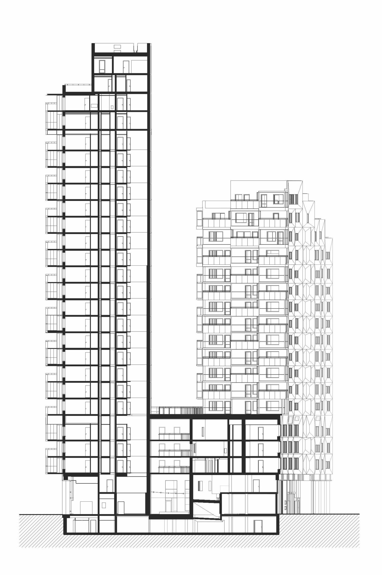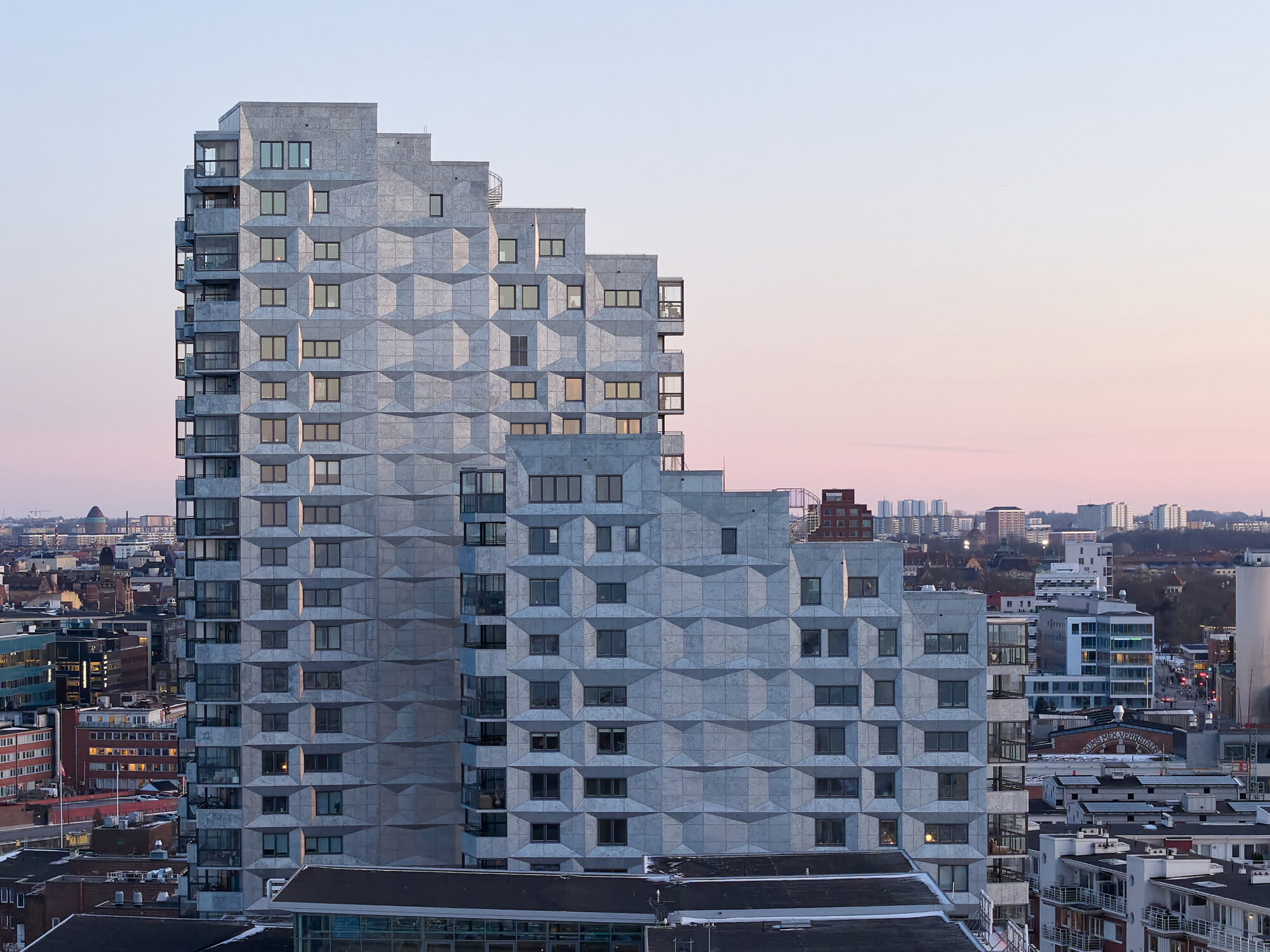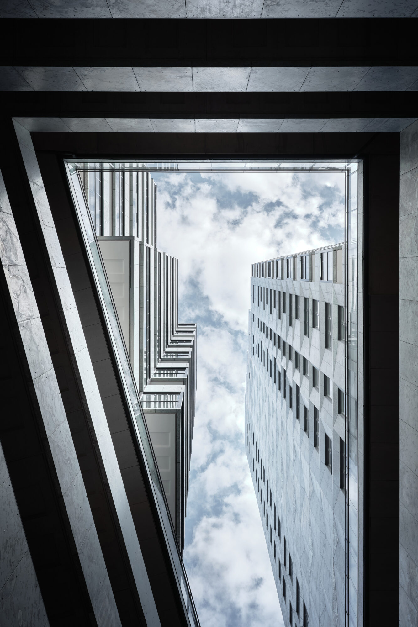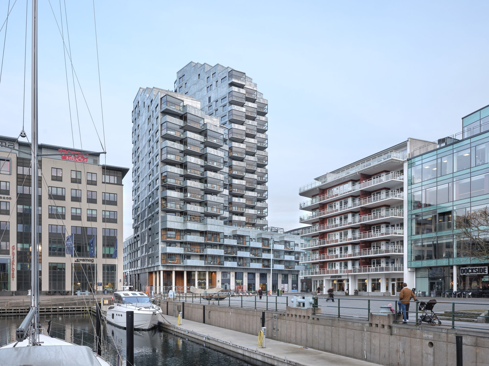 The new building closes the Dock Square to the east, creating a sheltered space where the folded and stepped shape of the Dock dampens the winds from the sea. The towers angle themselves to meet different urban spaces, and at the same time mark the eastern and western gates of the block.