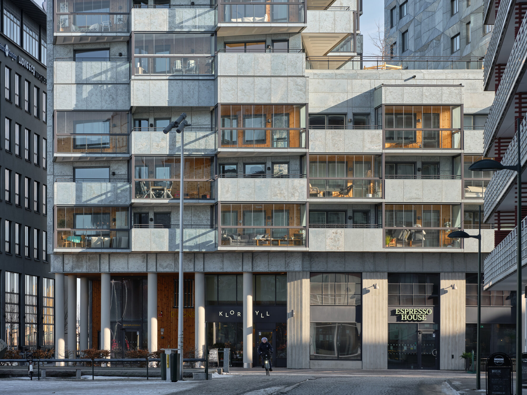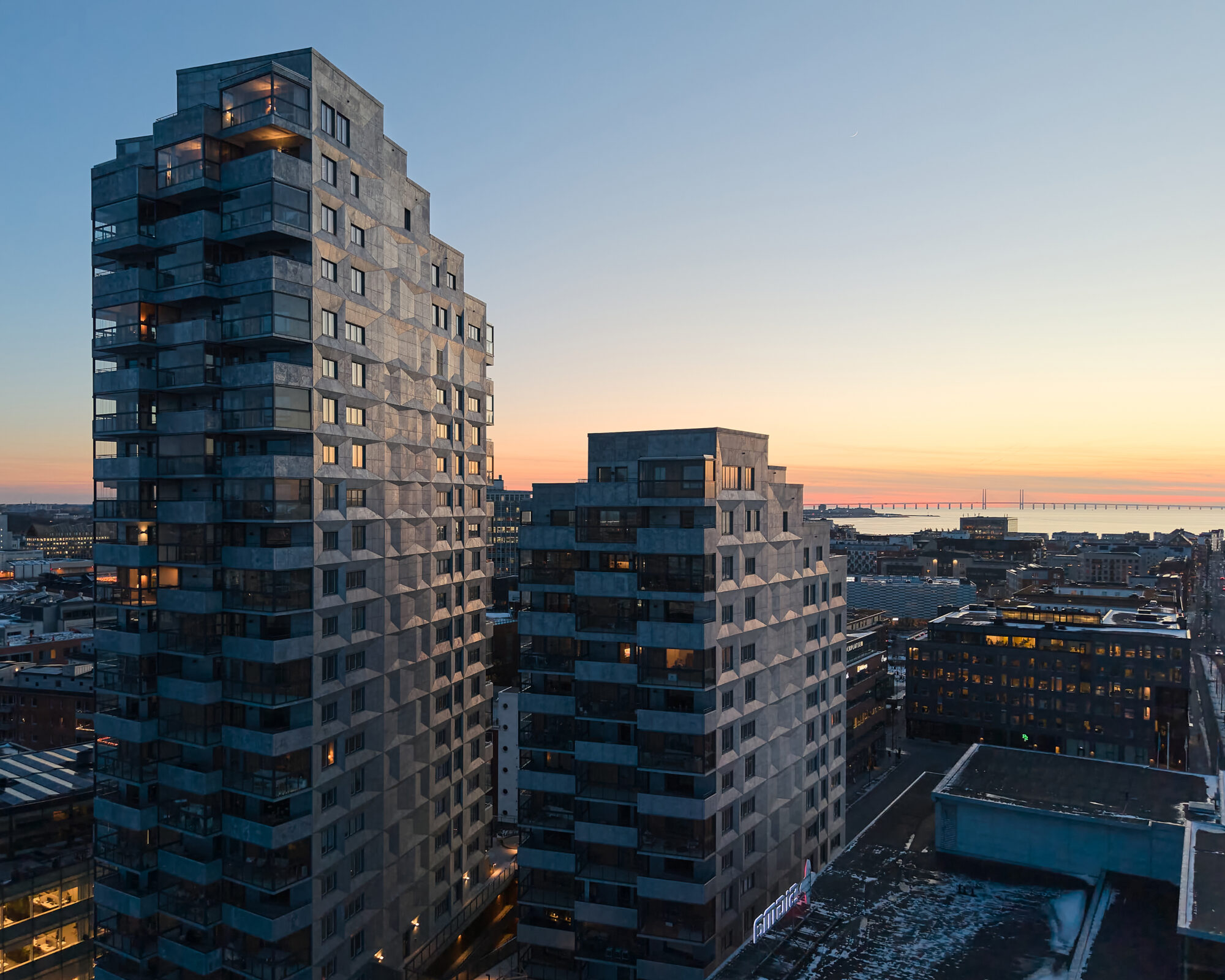 At the entrance to the harbor stands Docks, Malmö's new landmark. Two slender buildings that from certain angles seem to merge. Glazed balconies hover over the dock like the control cabins of the cranes that once appeared at the Kockum shipyard.
