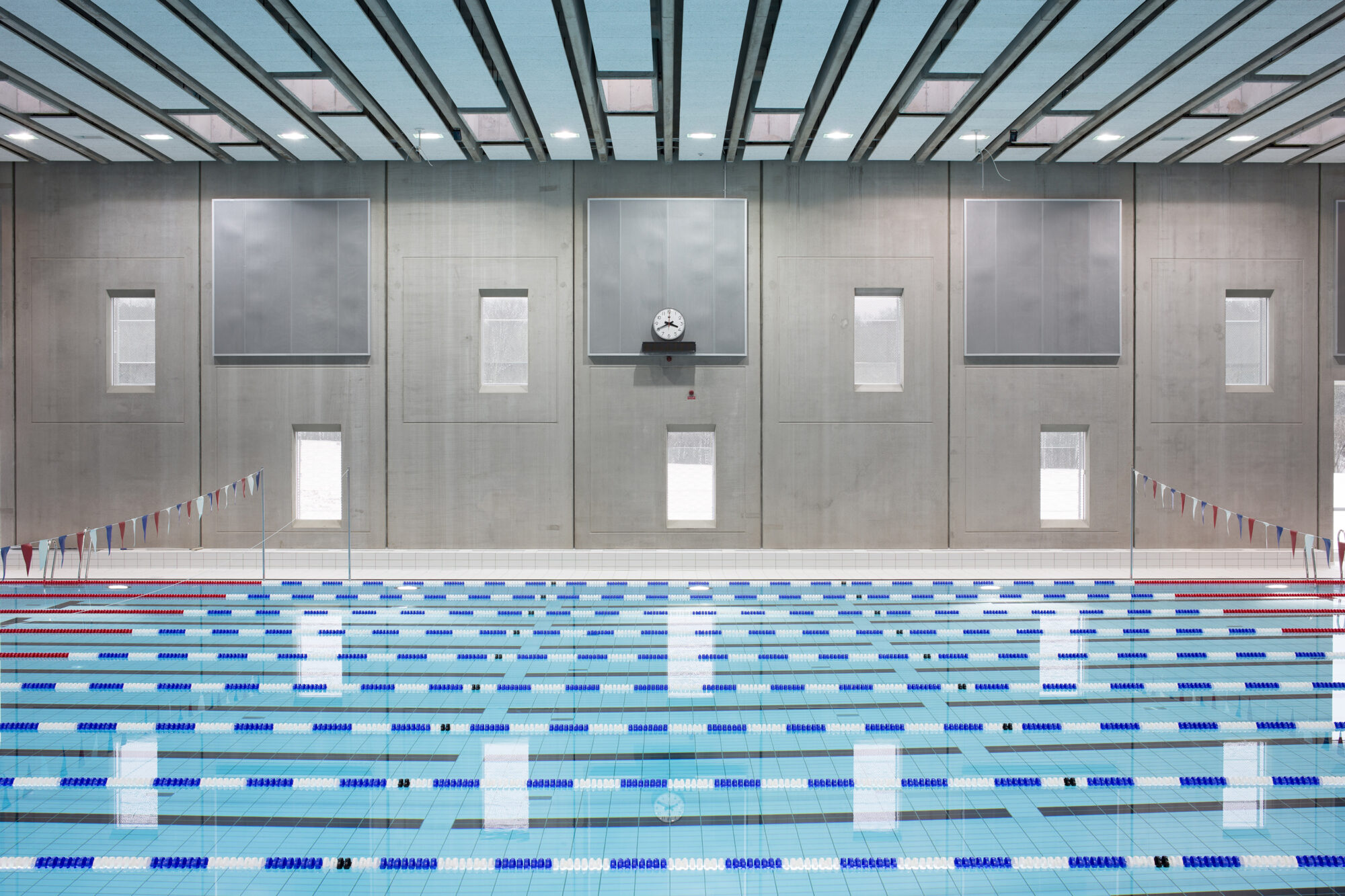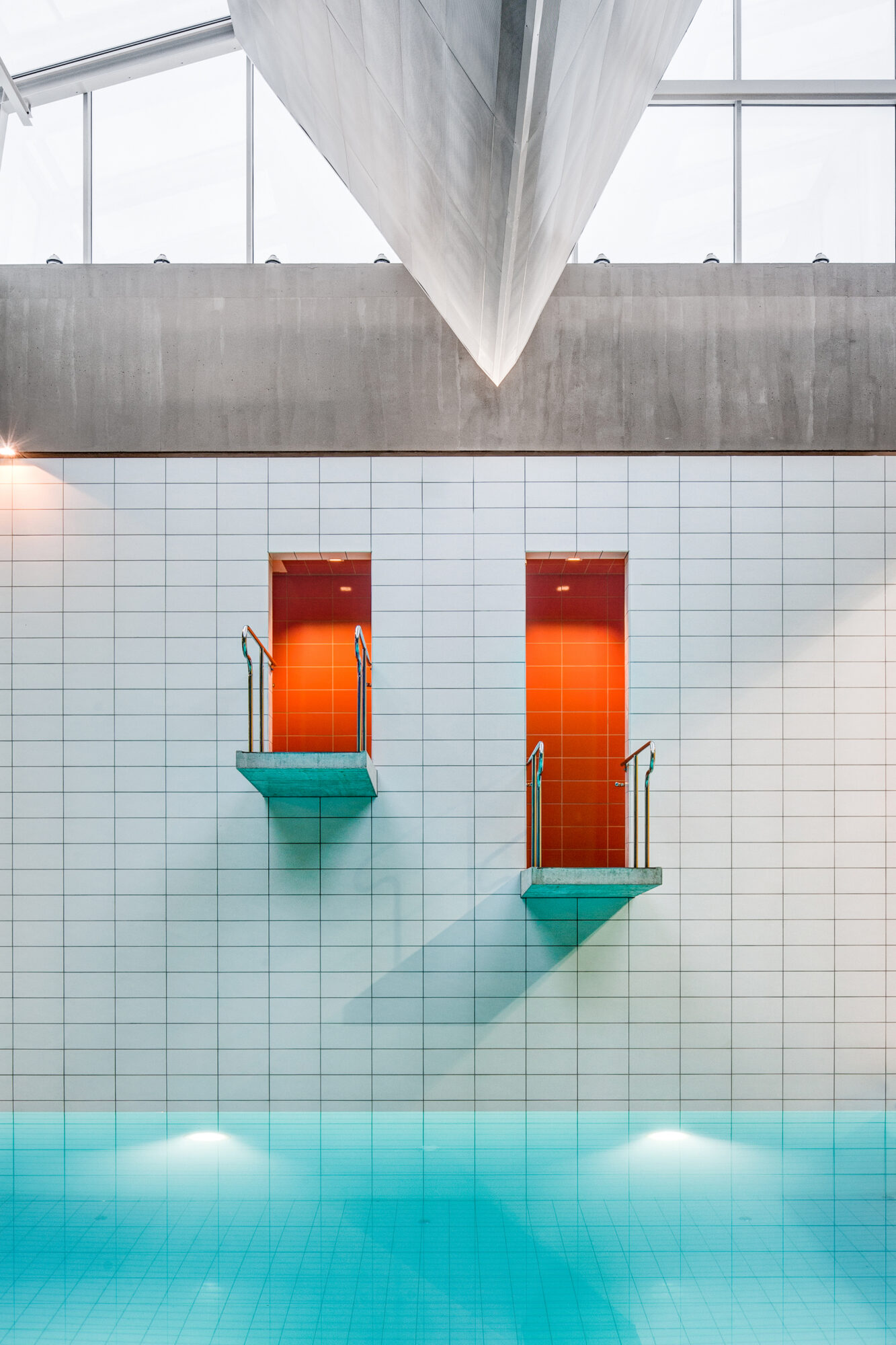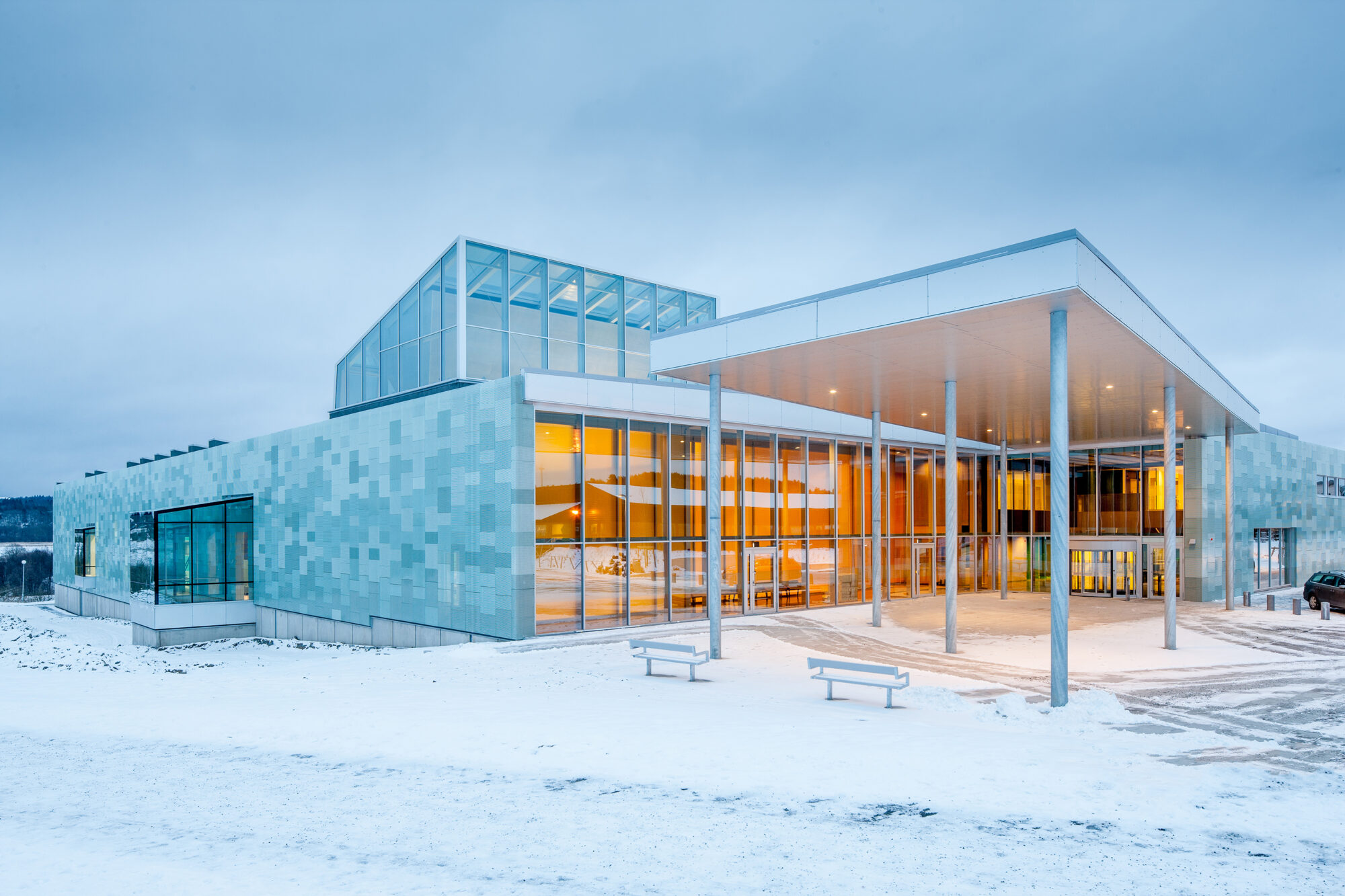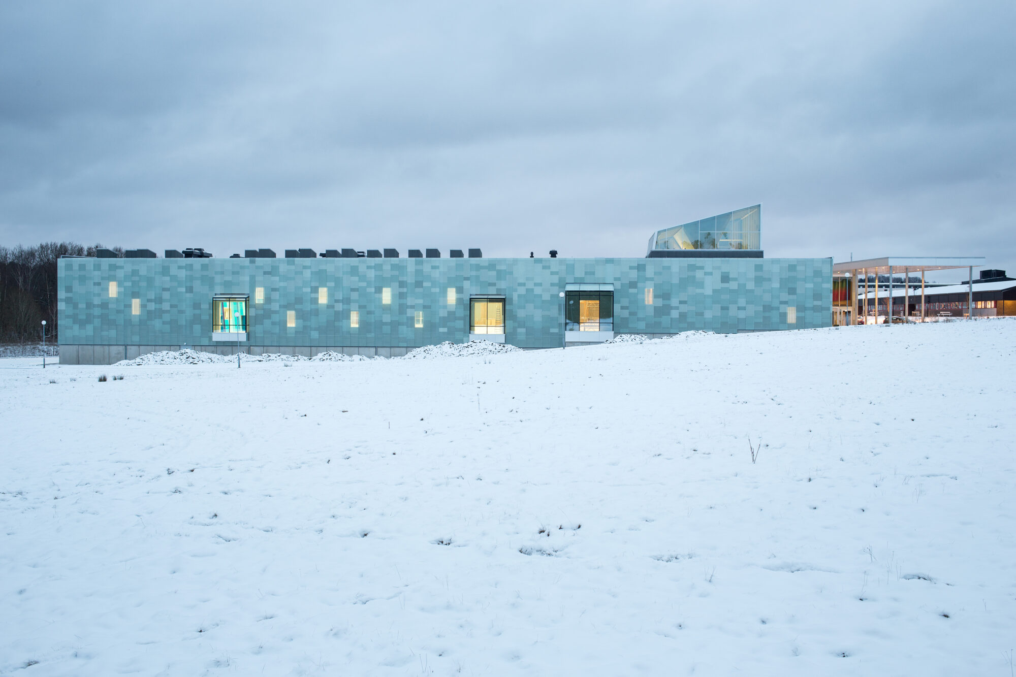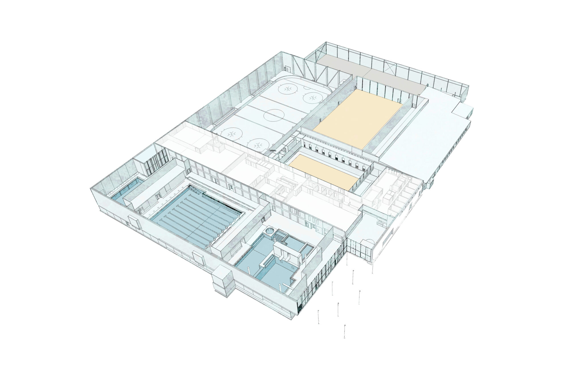 Badet och aktivitetshallen är byggda i betong, övriga hallar har lätta konstruktioner. Runt hela anläggningen sveper ett yttre skikt av hålad aluminium, med kassetter som färgsatts i olika blågröna nyanser. Tillsammans ska dessa ge en pixlad association till solglittrande vatten eller gnistrande isblock.