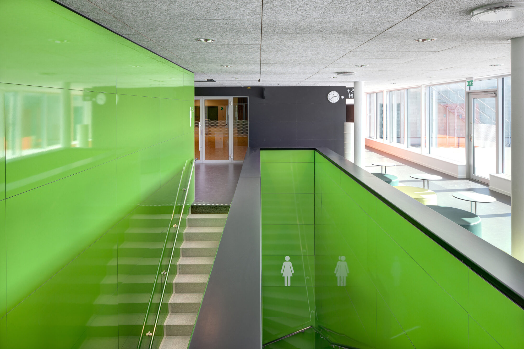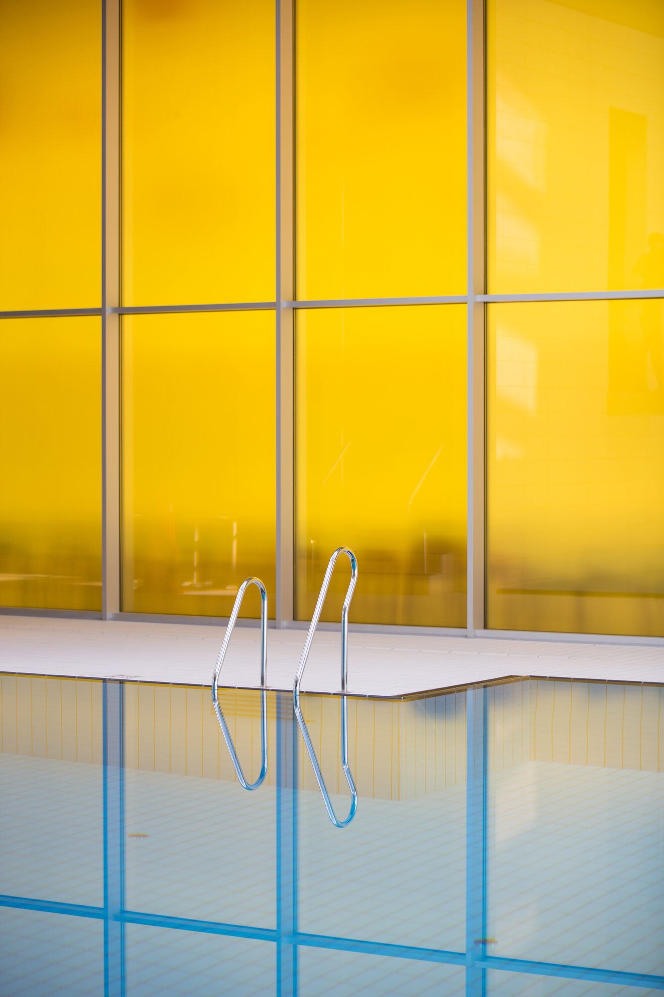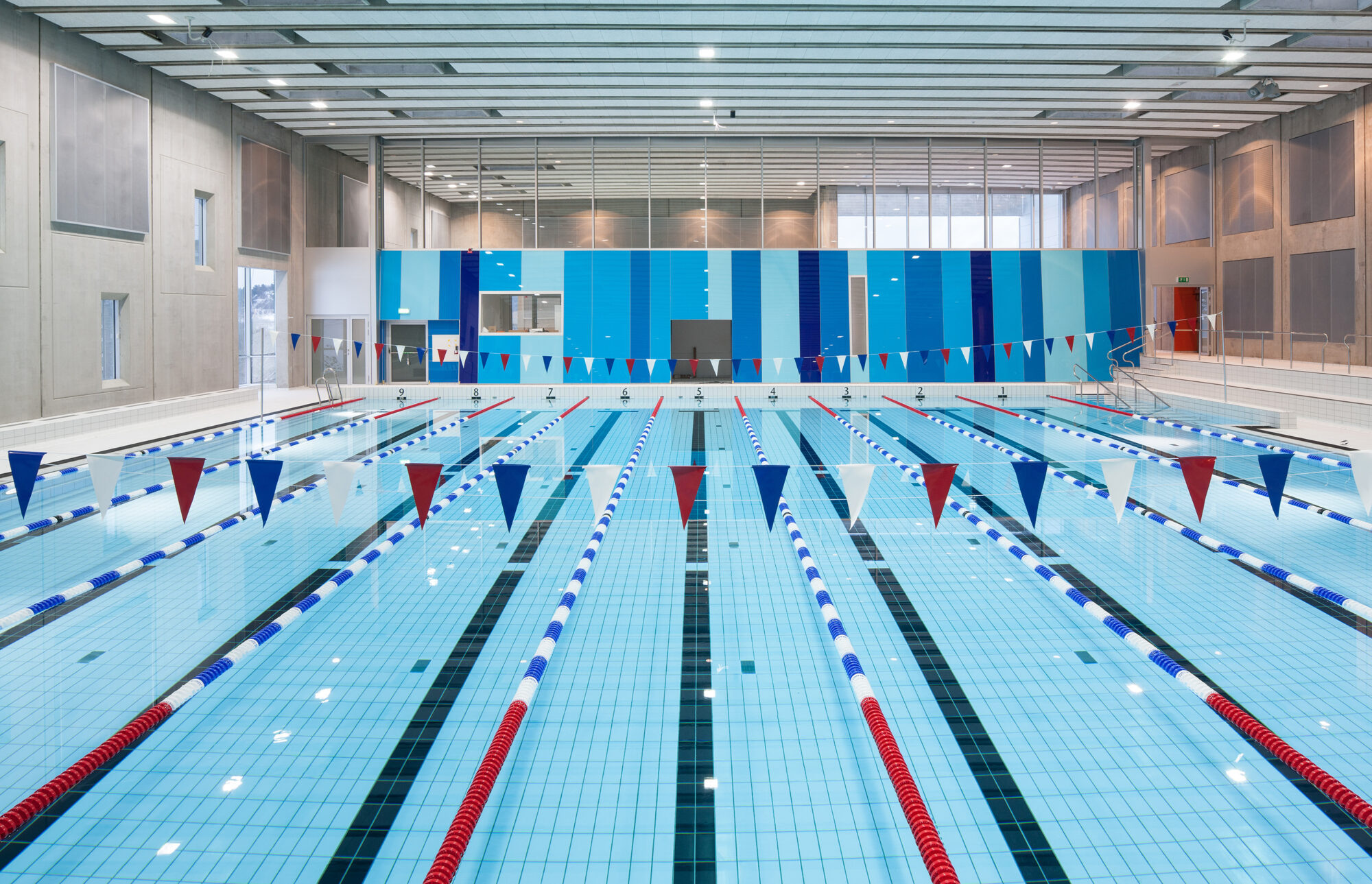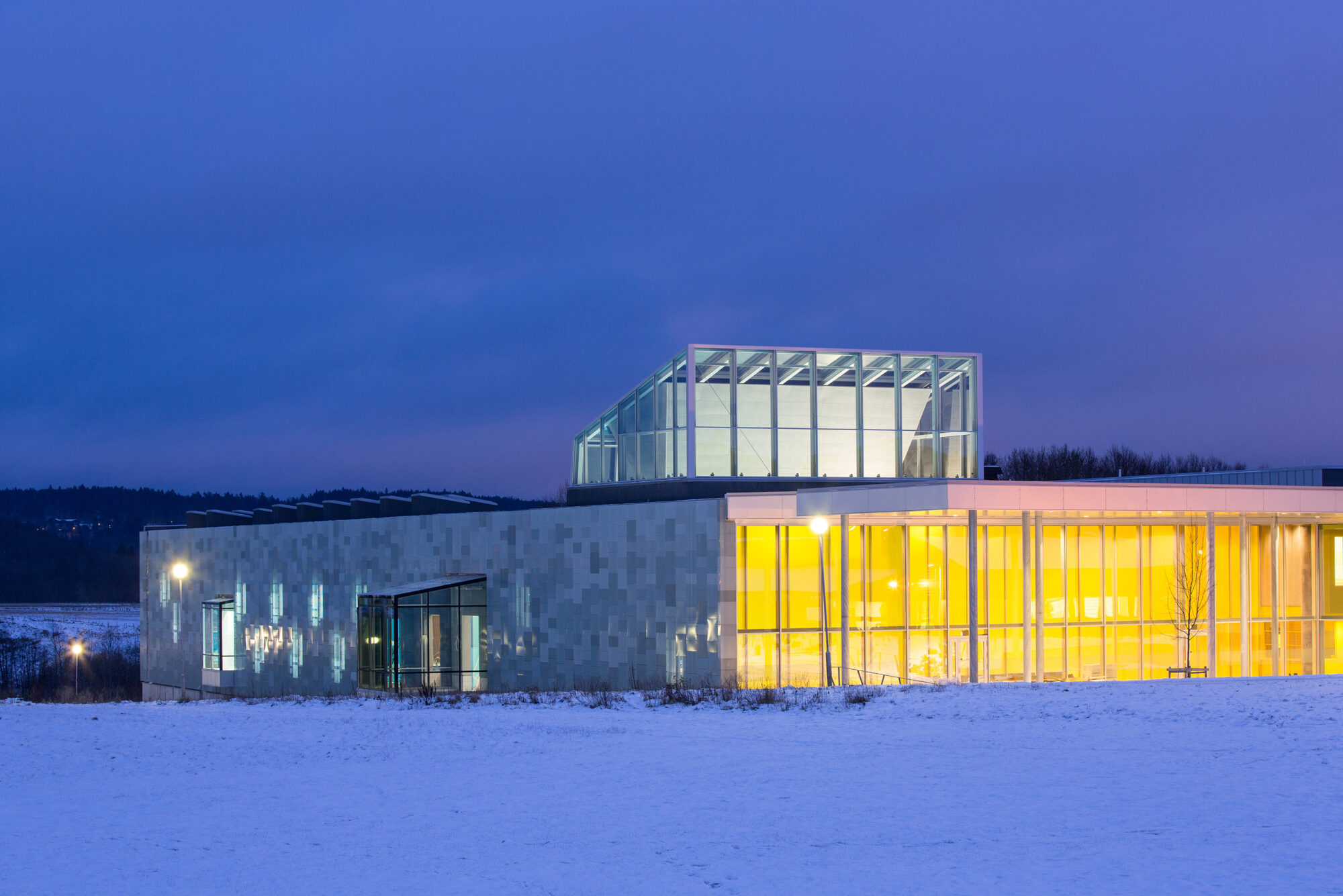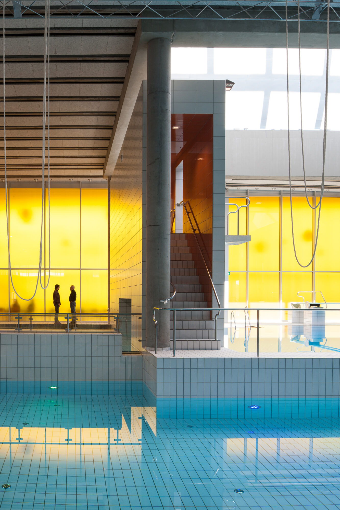 Badet och aktivitetshallen är byggda i betong, övriga hallar har lätta konstruktioner. Runt hela anläggningen sveper ett yttre skikt av hålad aluminium, med kassetter som färgsatts i olika blågröna nyanser. Tillsammans ska dessa ge en pixlad association till solglittrande vatten eller gnistrande isblock.
