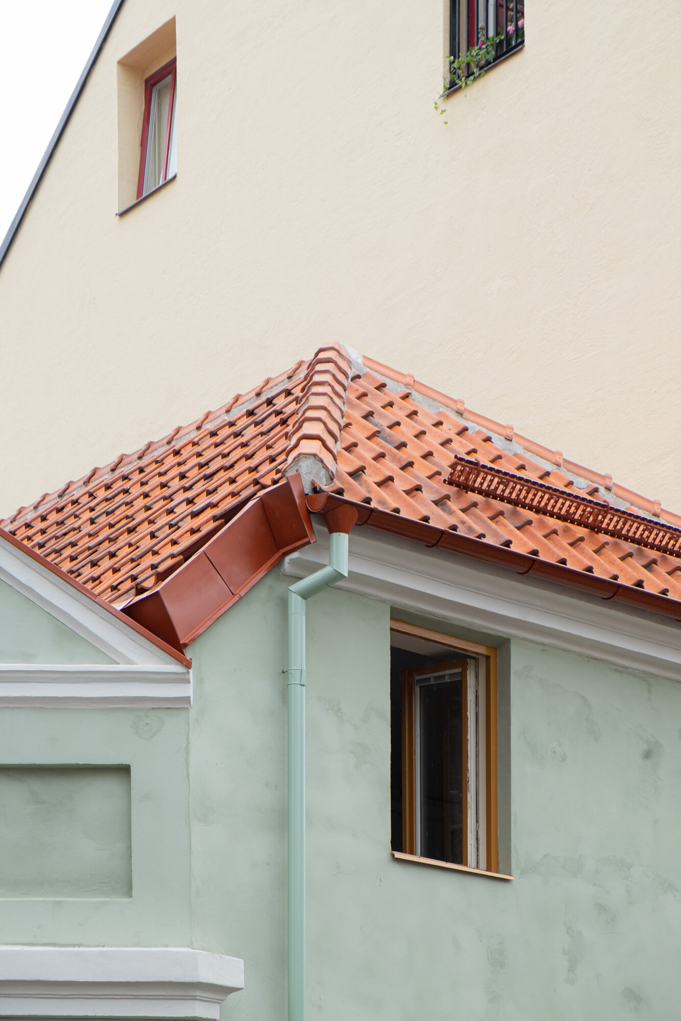 Detaljeringen är omsorgsfull och hantverksmässig. Valda material är uteslutande sinnliga och taktila, som exempelvis kalkfärg på fasaderna och dörrar av trä. Alla ytor, till och med taken, är penselstrukna för att hantverket ska synas och kännas.