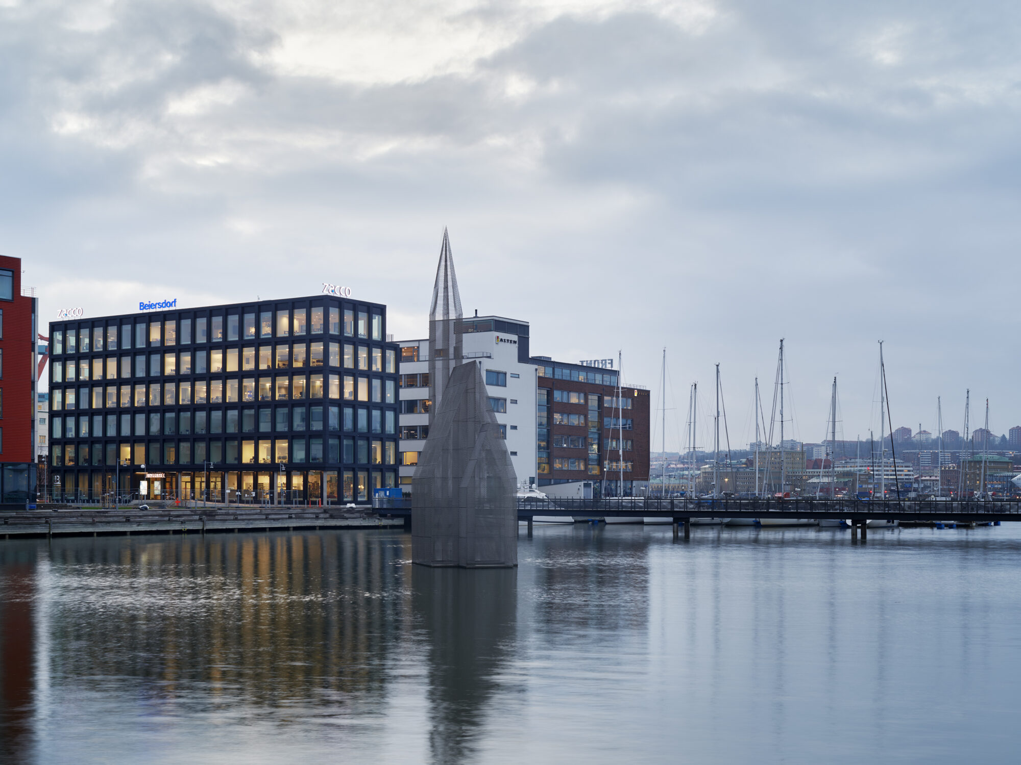 Fasaden är klädd med mörkt eloxerade kassetter av aluminium i ett konsekvent gittermönster kring jämnstora fönster. Byggnaden upplevs tack vare sina stora glaspartier extremt öppen, såväl utifrån som från insidan där hamnens vatten och båtar kan upplevas från i stort sett alla arbetsplatser.