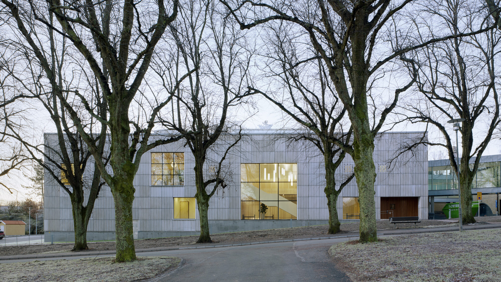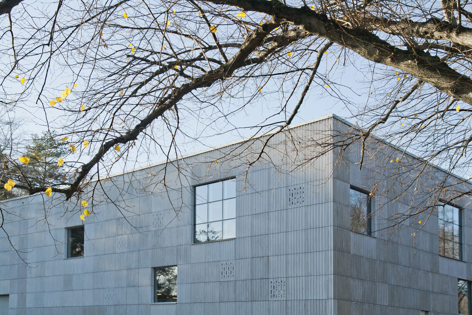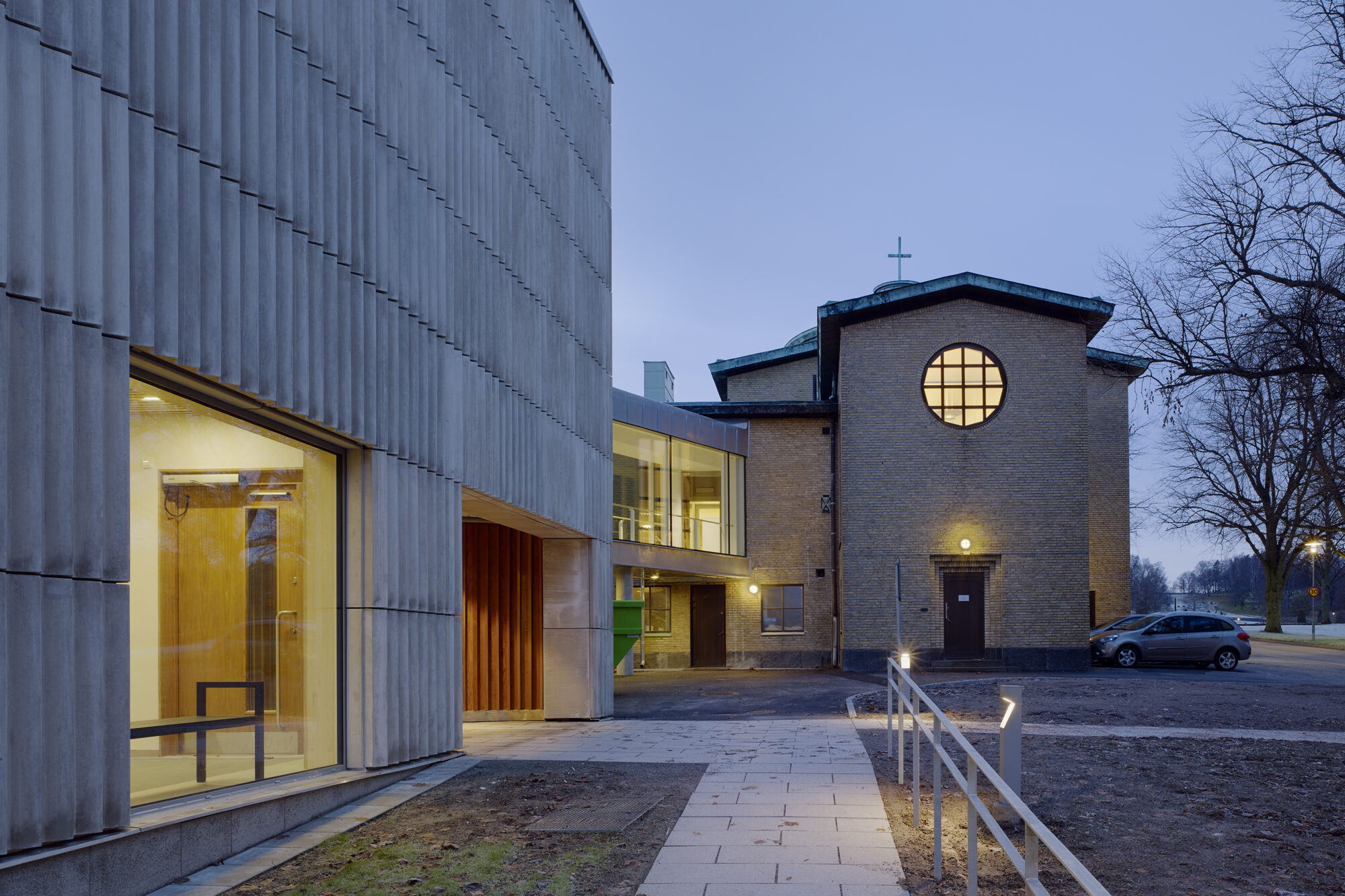 Fasadens veckade fiberbetong kontrasterar mot det gamla krematoriets tegel. På så vis har byggnaden fått en egen, stark karaktär. Vad som är gammalt respektive nytt blir tydligt och de båda bidrar till att förstärka varandra.