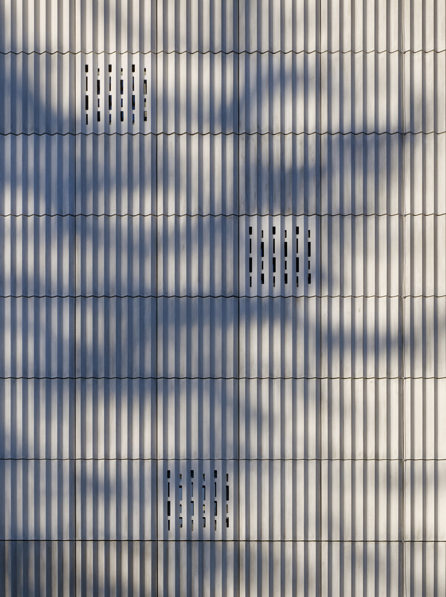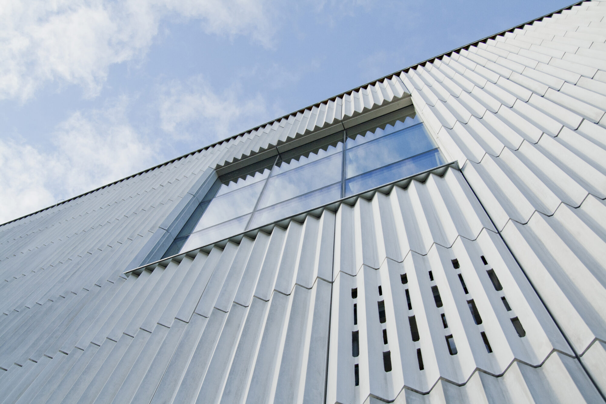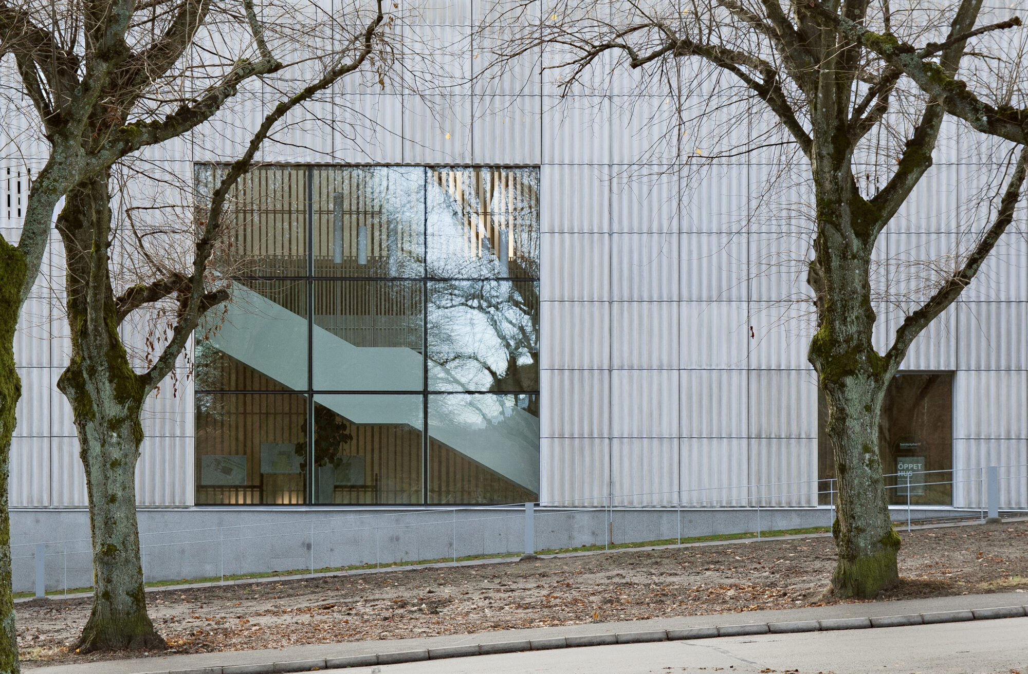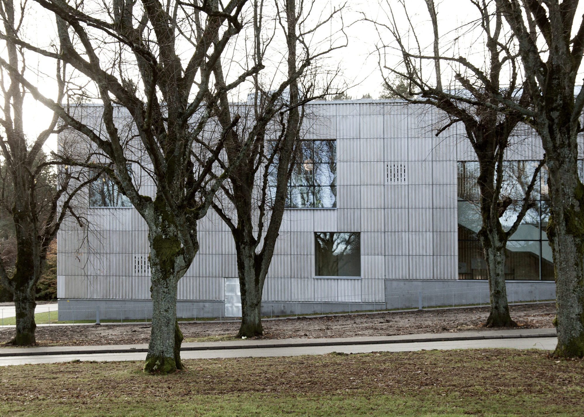 Fasadens veckade fiberbetong kontrasterar mot det gamla krematoriets tegel. På så vis har byggnaden fått en egen, stark karaktär. Vad som är gammalt respektive nytt blir tydligt och de båda bidrar till att förstärka varandra.
